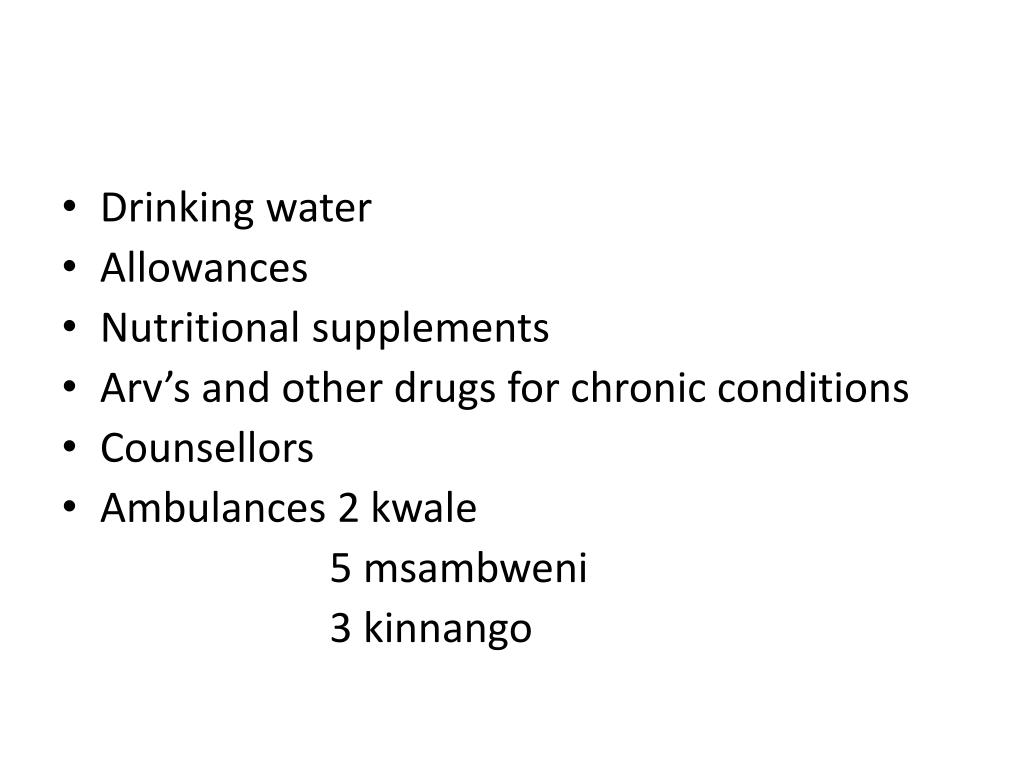 Drinking water • Allowances • Nutritional supplements • Arv’s and other drugs for chronic conditions • Counsellors • Ambulances 2 kwale 5 msambweni 3 kinnango