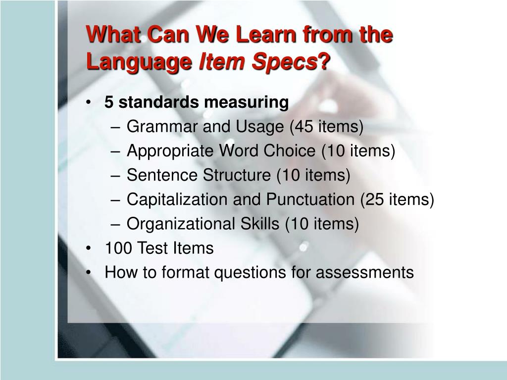 What Can We Learn from the Language Item Specs? 5 standards measuring Grammar and Usage (45 items) Appropriate Word Choice (10 items) Sentence Structure (10 items) Capitalization and Punctuation (25 items) Organizational Skills (10 items) 100 Test Items How to format questions for assessments