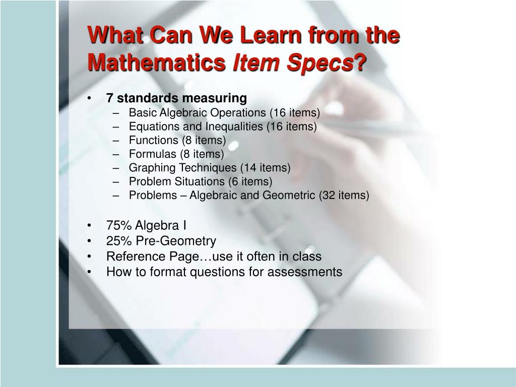 What Can We Learn from the Mathematics Item Specs? 7 standards measuring Basic Algebraic Operations (16 items) Equations and Inequalities (16 items) Functions (8 items) Formulas (8 items) Graphing Techniques (14 items) Problem Situations (6 items) Problems – Algebraic and Geometric (32 items) 75% Algebra I 25% Pre-Geometry Reference Page…use it often in class How to format questions for assessments