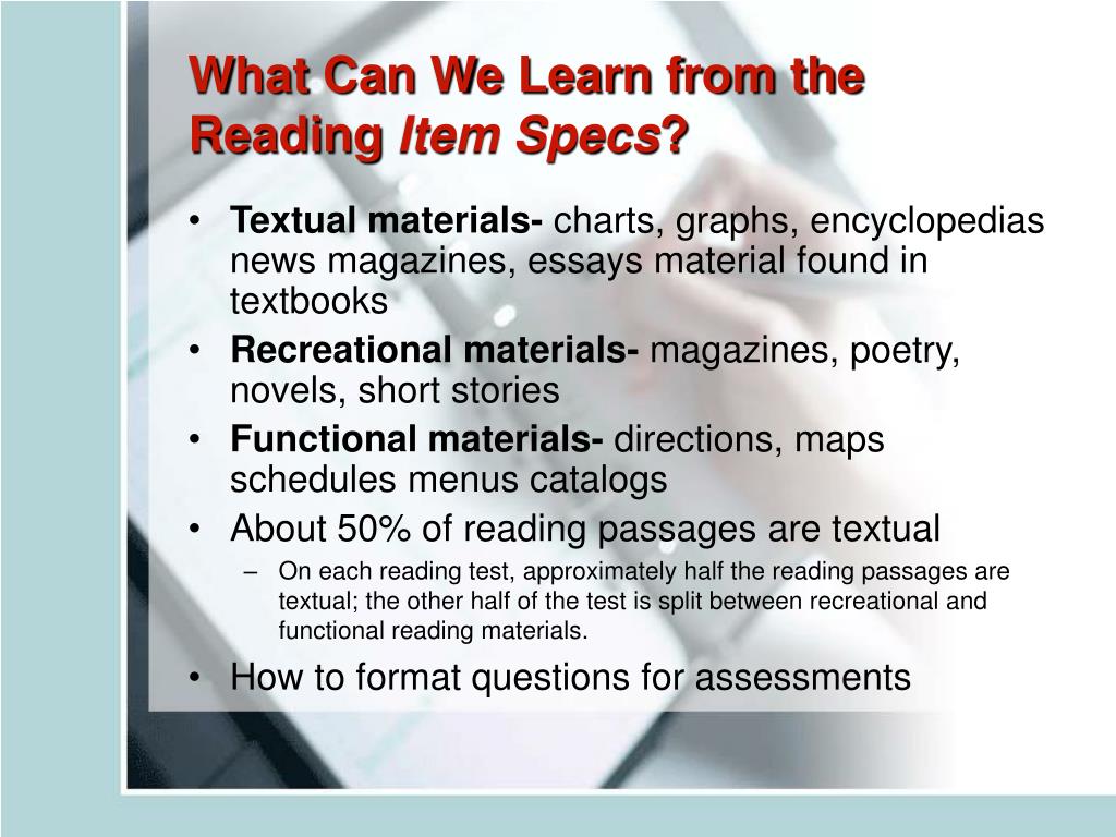 What Can We Learn from the Reading Item Specs? Textual materials- charts, graphs, encyclopedias news magazines, essays material found in textbooks Recreational materials- magazines, poetry, novels, short stories Functional materials- directions, maps schedules menus catalogs About 50% of reading passages are textual On each reading test, approximately half the reading passages are textual; the other half of the test is split between recreational and functional reading materials. How to format questions for assessments