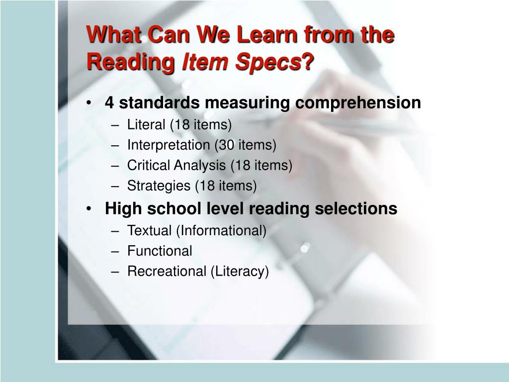 What Can We Learn from the Reading Item Specs? 4 standards measuring comprehension Literal (18 items) Interpretation (30 items) Critical Analysis (18 items) Strategies (18 items) High school level reading selections Textual (Informational) Functional Recreational (Literacy)