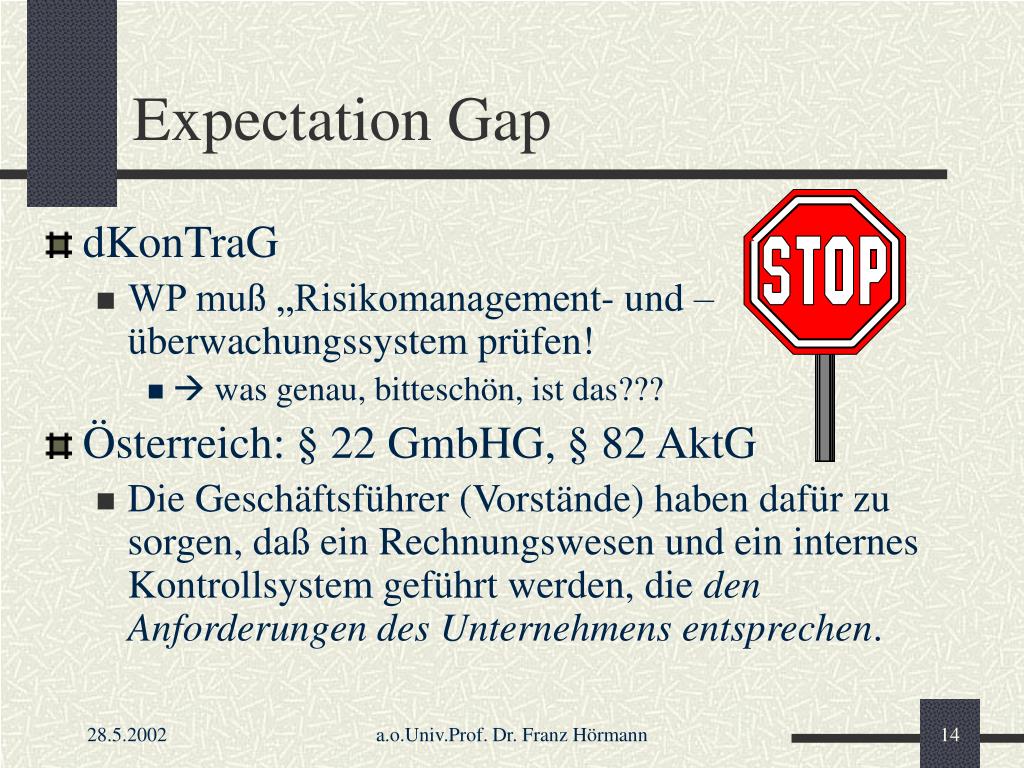 Expectation Gap • dKonTraG • WP muß „Risikomanagement- und –überwachungssystem prüfen! • was genau, bitteschön, ist das??? • Österreich: § 22 GmbHG, § 82 AktG • Die Geschäftsführer (Vorstände) haben dafür zu sorgen, daß ein Rechnungswesen und ein internes Kontrollsystem geführt werden, die den Anforderungen des Unternehmens entsprechen. a.o.Univ.Prof. Dr. Franz Hörmann