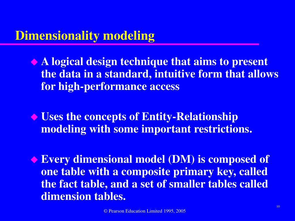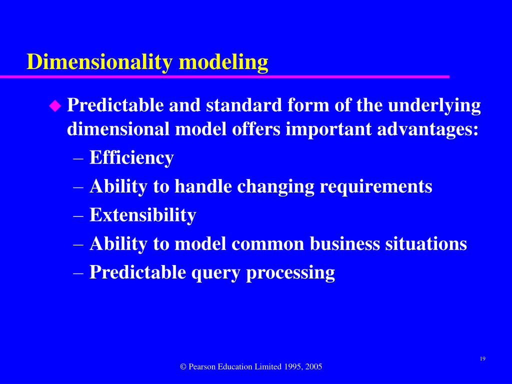 Dimensionality modeling • Predictable and standard form of the underlying dimensional model offers important advantages: • Efficiency • Ability to handle changing requirements • Extensibility • Ability to model common business situations • Predictable query processing © Pearson Education Limited 1995, 2005