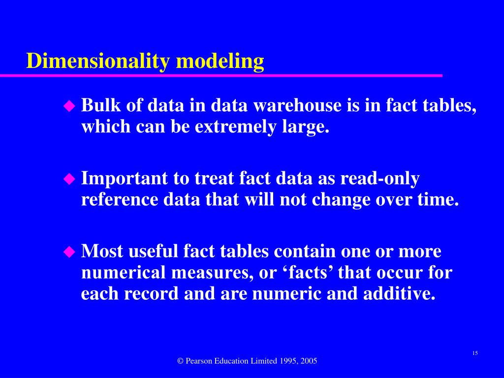 Dimensionality modeling • Bulk of data in data warehouse is in fact tables, which can be extremely large. • Important to treat fact data as read-only reference data that will not change over time. • Most useful fact tables contain one or more numerical measures, or ‘facts’ that occur for each record and are numeric and additive. © Pearson Education Limited 1995, 2005