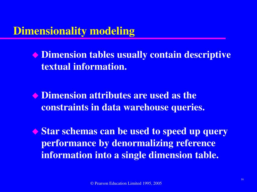 Dimensionality modeling • Dimension tables usually contain descriptive textual information. • Dimension attributes are used as the constraints in data warehouse queries. • Star schemas can be used to speed up query performance by denormalizing reference information into a single dimension table. © Pearson Education Limited 1995, 2005