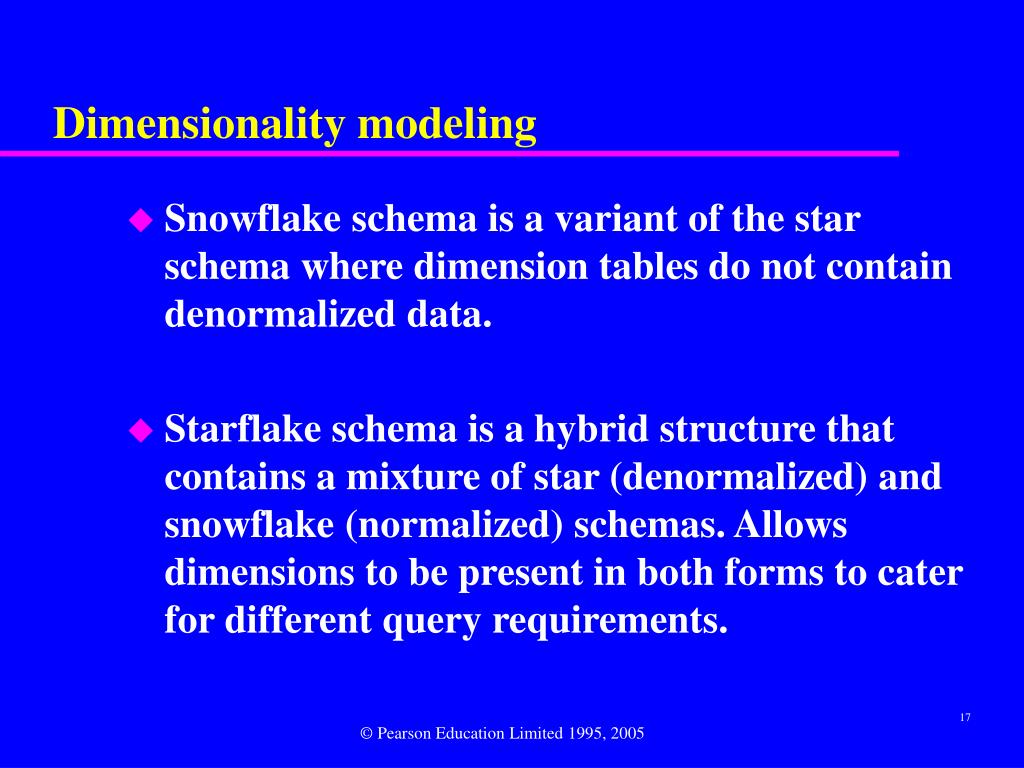 Dimensionality modeling • Snowflake schema is a variant of the star schema where dimension tables do not contain denormalized data. • Starflake schema is a hybrid structure that contains a mixture of star (denormalized) and snowflake (normalized) schemas. Allows dimensions to be present in both forms to cater for different query requirements. © Pearson Education Limited 1995, 2005