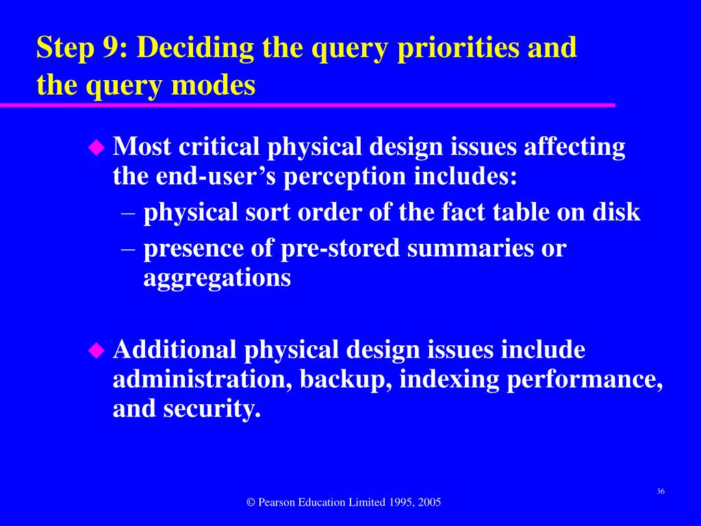 Step 9: Deciding the query priorities and the query modes • Most critical physical design issues affecting the end-user’s perception includes: • physical sort order of the fact table on disk • presence of pre-stored summaries or aggregations • Additional physical design issues include administration, backup, indexing performance, and security. © Pearson Education Limited 1995, 2005