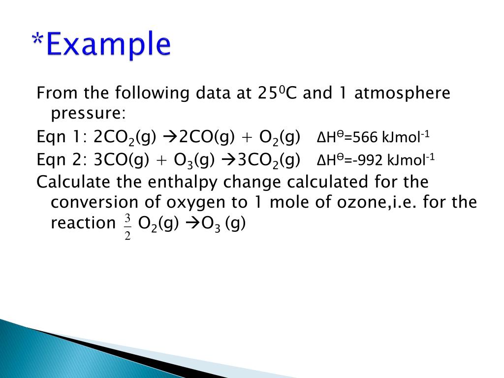 *Example From the following data at 250C and 1 atmosphere pressure: Eqn 1: 2CO2(g) 2CO(g) + O2(g) ΔHƟ=566 kJmol-1 Eqn 2: 3CO(g) + O3(g) 3CO2(g)ΔHƟ=-992 kJmol-1 Calculate the enthalpy change calculated for the conversion of oxygen to 1 mole of ozone,i.e. for the reaction O2(g) O3 (g)