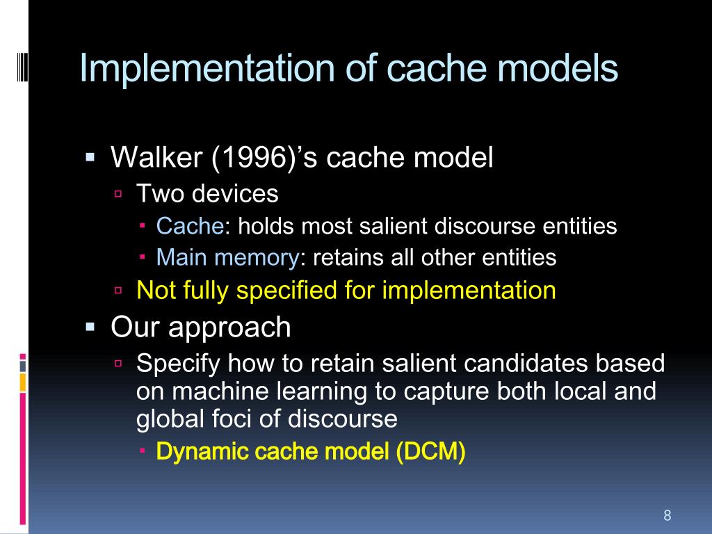 Implementation of cache models • Walker (1996)’s cache model • Two devices • Cache: holds most salient discourse entities • Main memory: retains all other entities • Not fully specified for implementation • Our approach • Specify how to retain salient candidates based on machine learning to capture both local and global foci of discourse • Dynamic cache model (DCM)