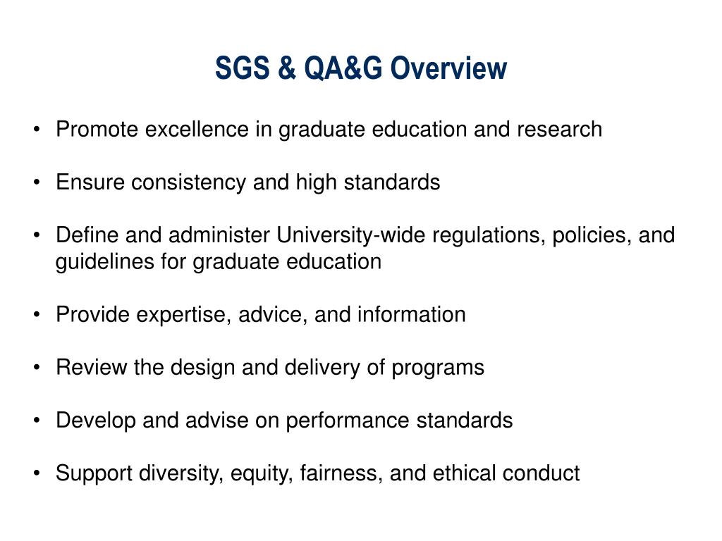 SGS &QA&G Overview • Promote excellence in graduate education and research • Ensure consistency and high standards • Define and administer University-wide regulations, policies, and guidelines for graduate education • Provide expertise, advice, and information • Review the design and delivery of programs • Develop and advise on performance standards • Support diversity, equity, fairness, and ethical conduct
