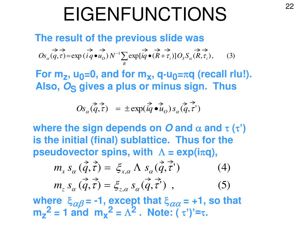 21 EIGENFUNCTIONS OR = a point group operation GO + a translation uO: so that (since GO leaves q invariant) Thus, the final result is