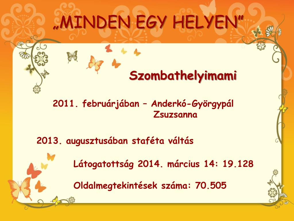 „MINDEN EGY HELYEN” Szombathelyimami 2011. februárjában – Anderkó-Györgypál Zsuzsanna 2013. augusztusában staféta váltás Látogatottság 2014. március 14: 19.128 Oldalmegtekintések száma: 70.505