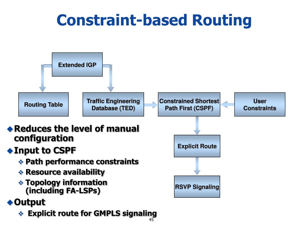Extended IGP Routing Table Traffic Engineering Database (TED) Constrained ShortestPath First (CSPF) User Constraints Explicit Route RSVP Signaling Constraint-based Routing • Reduces the level of manual configuration • Input to CSPF • Path performance constraints • Resource availability • Topology information(including FA-LSPs) • Output • Explicit route for GMPLS signaling