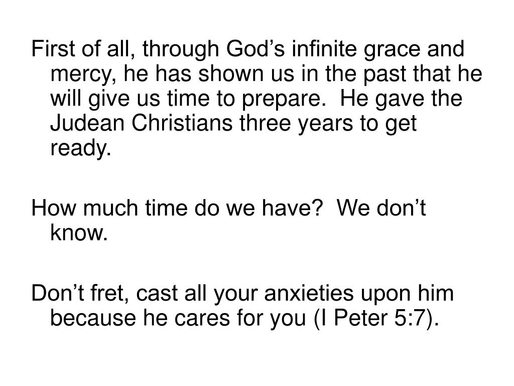 First of all, through God’s infinite grace and mercy, he has shown us in the past that he will give us time to prepare. He gave the Judean Christians three years to get ready. How much time do we have? We don’t know. Don’t fret, cast all your anxieties upon him because he cares for you (I Peter 5:7).