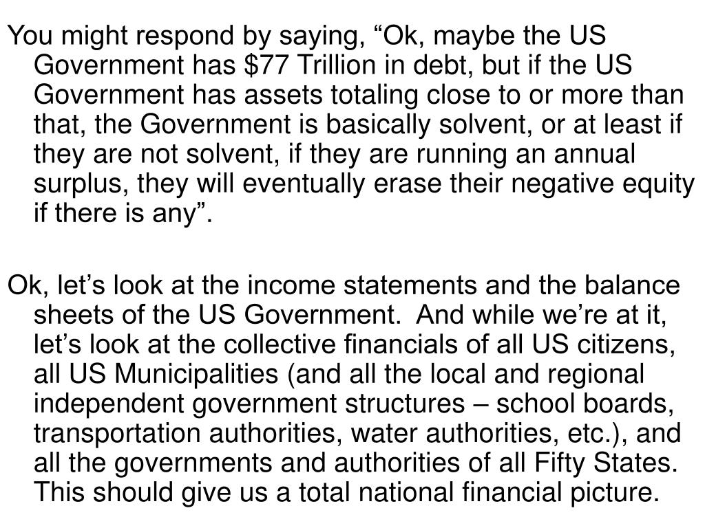 You might respond by saying, “Ok, maybe the US Government has $77 Trillion in debt, but if the US Government has assets totaling close to or more than that, the Government is basically solvent, or at least if they are not solvent, if they are running an annual surplus, they will eventually erase their negative equity if there is any”. Ok, let’s look at the income statements and the balance sheets of the US Government. And while we’re at it, let’s look at the collective financials of all US citizens, all US Municipalities (and all the local and regional independent government structures – school boards, transportation authorities, water authorities, etc.), and all the governments and authorities of all Fifty States. This should give us a total national financial picture.