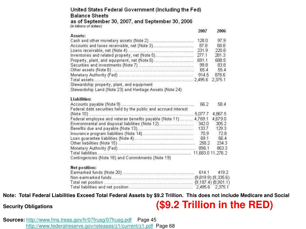 Note: Total Federal Liabilities Exceed Total Federal Assets by $9.2 Trillion. This does not include Medicare and Social Security Obligations ($9.2 Trillion in the RED)Sources: http://www.fms.treas.gov/fr/07frusg/07frusg.pdf Page 45http://www.federalreserve.gov/releases/z1/current/z1.pdf Page 68