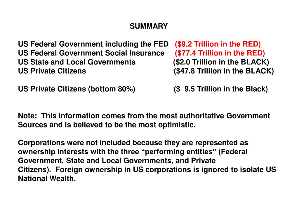 SUMMARY US Federal Government including the FED ($9.2 Trillion in the RED)US Federal GovernmentSocial Insurance($77.4 Trillion in the RED)US State and Local Governments ($2.0 Trillion in the BLACK) US Private Citizens ($47.8 Trillion in the BLACK) US Private Citizens (bottom 80%) ($ 9.5 Trillion in the Black) Note: This information comes from the most authoritative Government Sources and is believed to be the most optimistic. Corporations were not included because they are represented as ownership interests with the three “performing entities” (Federal Government, State and Local Governments, and Private Citizens). Foreign ownership in US corporations is ignored to isolate US National Wealth.