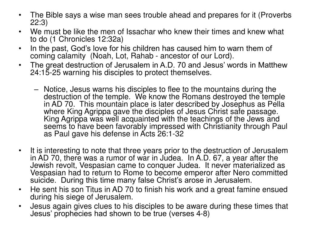 The Bible says a wise man sees trouble ahead and prepares for it (Proverbs 22:3) • We must be like the men of Issachar who knew their times and knew what to do (1 Chronicles 12:32a) • In the past, God’s love for his children has caused him to warn them of coming calamity (Noah, Lot, Rahab - ancestor of our Lord). • The great destruction of Jerusalem in A.D. 70 and Jesus’ words in Matthew 24:15-25 warning his disciples to protect themselves. • Notice, Jesus warns his disciples to flee to the mountains during the destruction of the temple. We know the Romans destroyed the temple in AD 70. This mountain place is later described by Josephus as Pella where King Agrippa gave the disciples of Jesus Christ safe passage. King Agrippa was well acquainted with the teachings of the Jews and seems to have been favorably impressed with Christianity through Paul as Paul gave his defense in Acts 26:1-32 • It is interesting to note that three years prior to the destruction of Jerusalem in AD 70, there was a rumor of war in Judea. In A.D. 67, a year after the Jewish revolt, Vespasian came to conquer Judea. It never materialized as Vespasian had to return to Rome to become emperor after Nero committed suicide. During this time many false Christ’s arose in Jerusalem. • He sent his son Titus in AD 70 to finish his work and a great famine ensued during his siege of Jerusalem. • Jesus again gives clues to his disciples to be aware during these times that Jesus’ prophecies had shown to be true (verses 4-8)
