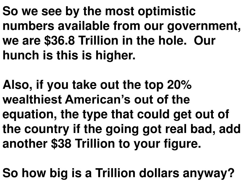 So we see by the most optimistic numbers available from our government, we are $36.8 Trillion in the hole. Our hunch is this is higher. Also, if you take out the top 20% wealthiest American’s out of the equation, the type that could get out of the country if the going got real bad, add another $38 Trillion to your figure. So how big is a Trillion dollars anyway?