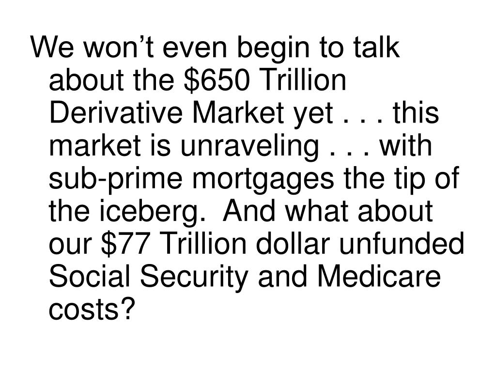 We won’t even begin to talk about the $650 Trillion Derivative Market yet . . . this market is unraveling . . . with sub-prime mortgages the tip of the iceberg. And what about our $77 Trillion dollar unfunded Social Security and Medicare costs?