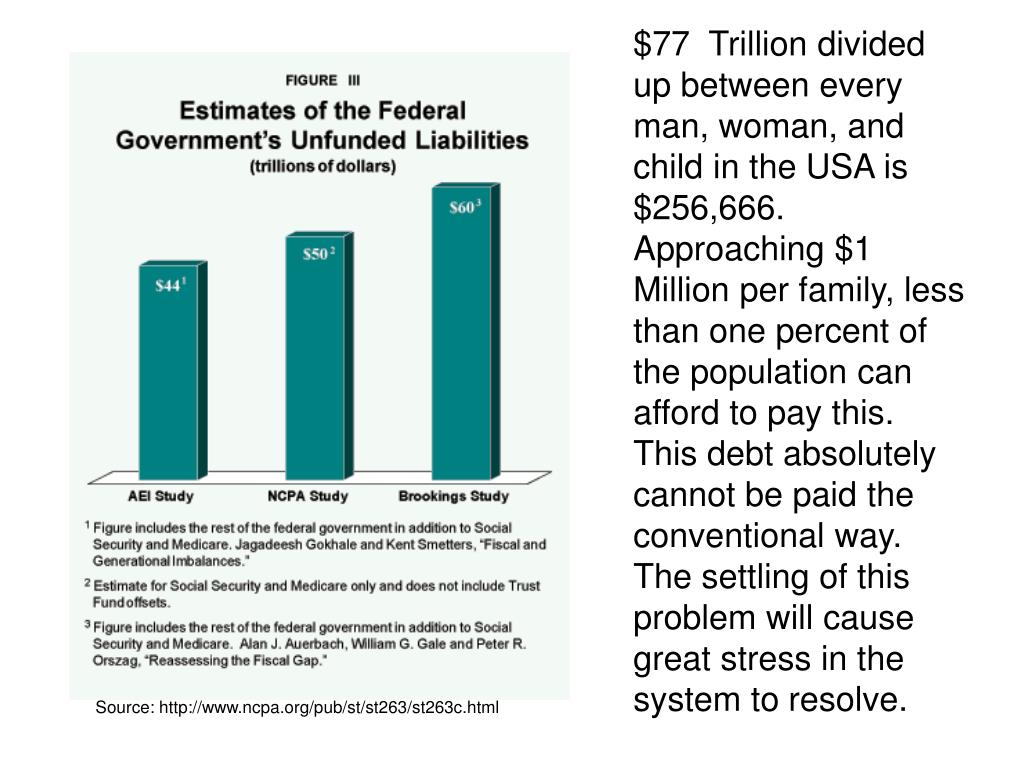 $77 Trillion divided up between every man, woman, and child in the USA is $256,666. Approaching $1 Million per family, less than one percent of the population can afford to pay this. This debt absolutely cannot be paid the conventional way. The settling of this problem will cause great stress in the system to resolve. Source: http://www.ncpa.org/pub/st/st263/st263c.html