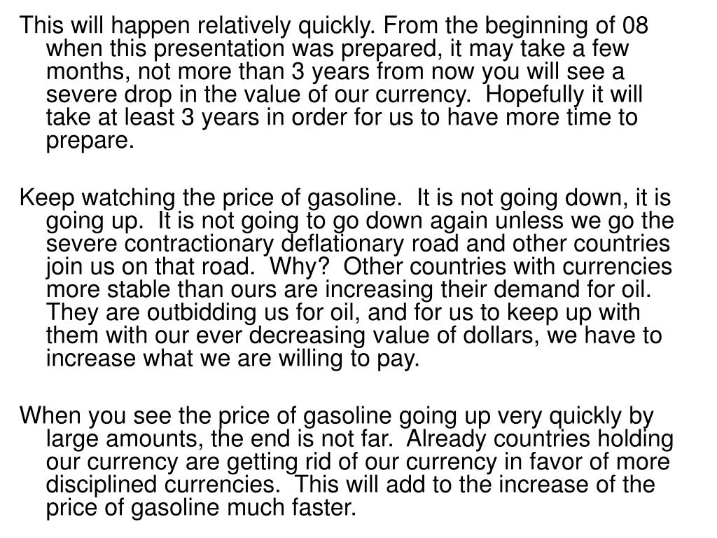 This will happen relatively quickly. From the beginning of 08 when this presentation was prepared, it may take a few months, not more than 3 years from now you will see a severe drop in the value of our currency. Hopefully it will take at least 3 years in order for us to have more time to prepare. Keep watching the price of gasoline. It is not going down, it is going up. It is not going to go down again unless we go the severe contractionary deflationary road and other countries join us on that road. Why? Other countries with currencies more stable than ours are increasing their demand for oil. They are outbidding us for oil, and for us to keep up with them with our ever decreasing value of dollars, we have to increase what we are willing to pay. When you see the price of gasoline going up very quickly by large amounts, the end is not far. Already countries holding our currency are getting rid of our currency in favor of more disciplined currencies. This will add to the increase of the price of gasoline much faster.