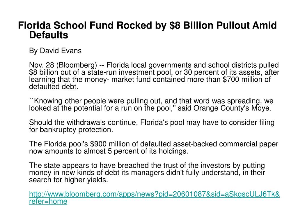 Florida School Fund Rocked by $8 Billion Pullout Amid Defaults By David Evans Nov. 28 (Bloomberg) -- Florida local governments and school districts pulled $8 billion out of a state-run investment pool, or 30 percent of its assets, after learning that the money- market fund contained more than $700 million of defaulted debt. ``Knowing other people were pulling out, and that word was spreading, we looked at the potential for a run on the pool,'' said Orange County's Moye. Should the withdrawals continue, Florida's pool may have to consider filing for bankruptcy protection. The Florida pool's $900 million of defaulted asset-backed commercial paper now amounts to almost 5 percent of its holdings. The state appears to have breached the trust of the investors by putting money in new kinds of debt its managers didn't fully understand, in their search for higher yields. http://www.bloomberg.com/apps/news?pid=20601087&sid=aSkgscULJ6Tk&refer=home