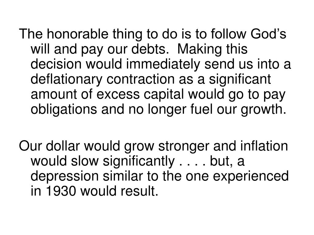 The honorable thing to do is to follow God’s will and pay our debts. Making this decision would immediately send us into a deflationary contraction as a significant amount of excess capital would go to pay obligations and no longer fuel our growth. Our dollar would grow stronger and inflation would slow significantly . . . . but, a depression similar to the one experienced in 1930 would result.