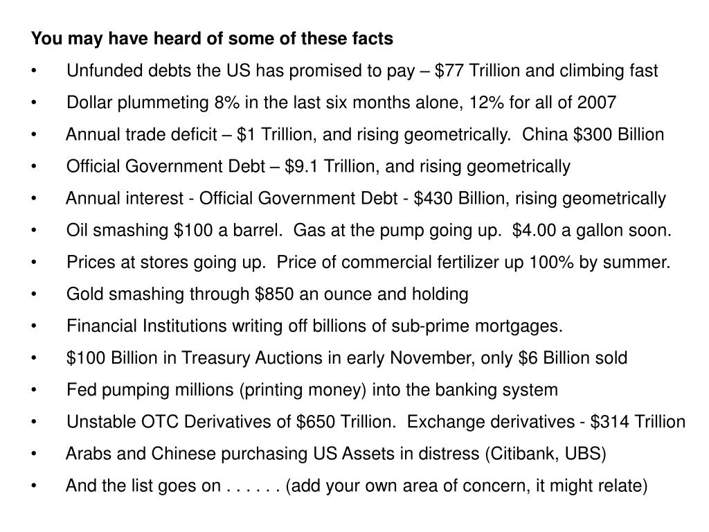 You may have heard of some of these facts • Unfunded debts the US has promised to pay – $77 Trillion and climbing fast • Dollar plummeting 8% in the last six months alone, 12% for all of 2007 • Annual trade deficit – $1 Trillion, and rising geometrically. China $300 Billion • Official Government Debt – $9.1 Trillion, and rising geometrically • Annual interest - Official Government Debt - $430 Billion, rising geometrically • Oil smashing $100 a barrel. Gas at the pump going up. $4.00 a gallon soon. • Prices at stores going up. Price of commercial fertilizer up 100% by summer. • Gold smashing through $850 an ounce and holding • Financial Institutions writing off billions of sub-prime mortgages. • $100 Billion in Treasury Auctions in early November, only $6 Billion sold • Fed pumping millions (printing money) into the banking system • Unstable OTC Derivatives of $650 Trillion. Exchange derivatives - $314 Trillion • Arabs and Chinese purchasing US Assets in distress (Citibank, UBS) • And the list goes on . . . . . . (add your own area of concern, it might relate)