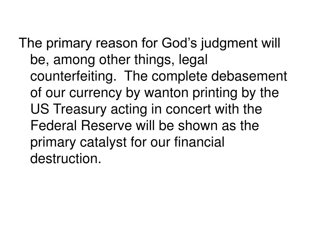 The primary reason for God’s judgment will be, among other things, legal counterfeiting. The complete debasement of our currency by wanton printing by the US Treasury acting in concert with the Federal Reserve will be shown as the primary catalyst for our financial destruction.