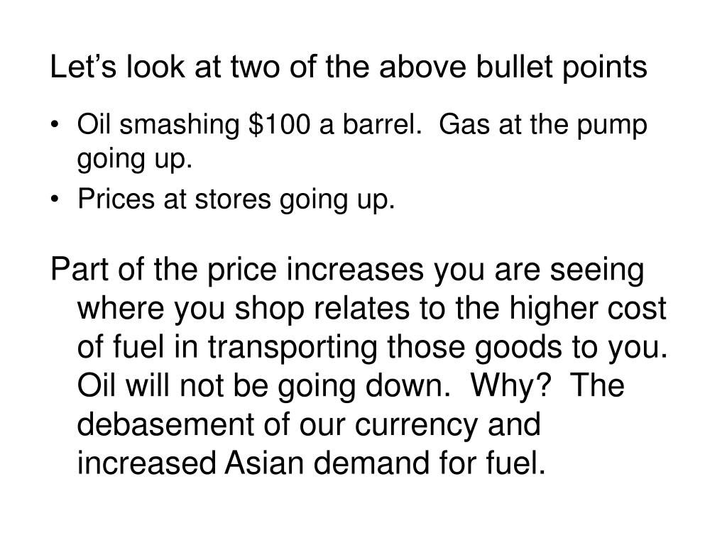 Let’s look at two of the above bullet points • Oil smashing $100 a barrel. Gas at the pump going up. • Prices at stores going up. Part of the price increases you are seeing where you shop relates to the higher cost of fuel in transporting those goods to you. Oil will not be going down. Why? The debasement of our currency and increased Asian demand for fuel.