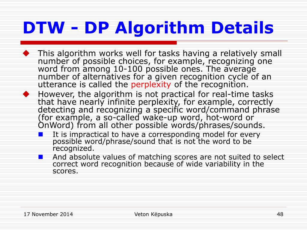 DTW - DP Algorithm Details • This algorithm works well for tasks having a relatively small number of possible choices, for example, recognizing one word from among 10-100 possible ones. The average number of alternatives for a given recognition cycle of an utterance is called the perplexity of the recognition. • However, the algorithm is not practical for real-time tasks that have nearly infinite perplexity, for example, correctly detecting and recognizing a specific word/command phrase (for example, a so-called wake-up word, hot-word or OnWord) from all other possible words/phrases/sounds. • It is impractical to have a corresponding model for every possible word/phrase/sound that is not the word to be recognized. • And absolute values of matching scores are not suited to select correct word recognition because of wide variability in the scores. Veton Këpuska