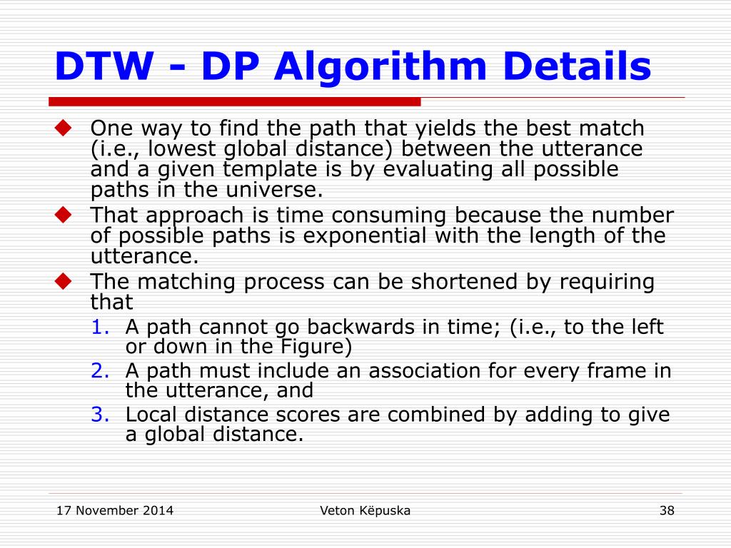 DTW - DP Algorithm Details • One way to find the path that yields the best match (i.e., lowest global distance) between the utterance and a given template is by evaluating all possible paths in the universe. • That approach is time consuming because the number of possible paths is exponential with the length of the utterance. • The matching process can be shortened by requiring that • A path cannot go backwards in time; (i.e., to the left or down in the Figure) • A path must include an association for every frame in the utterance, and • Local distance scores are combined by adding to give a global distance. Veton Këpuska