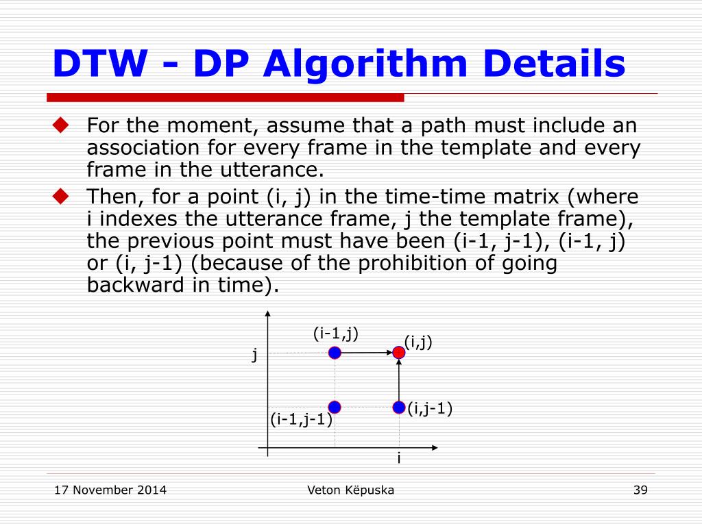 DTW - DP Algorithm Details • The principle of dynamic programming (DP) is that a point (i, j), the next selected point on the path, comes from one among (i-1, j-1), (i-1, j) or (i, j-1) that has the lowest distance. • DP finds the lowest distance path through the matrix, while minimizing the amount of computation. • The DP algorithm operates in a time-synchronous manner by considering each column of the time-time matrix in succession (which is equivalent to processing the utterance frame-by-frame). • For a template of length N (corresponding to an N-row matrix), the maximum number of paths being considered at any time is N. • A test utterance feature vector j is compared to all reference template features, 1…N, thus generating a vector of corresponding local distances d(1, j), d(2, j), … d(N, j). Veton Këpuska