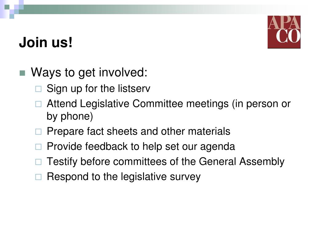 Join us! • Ways to get involved: • Sign up for the listserv • Attend Legislative Committee meetings (in person or by phone) • Prepare fact sheets and other materials • Provide feedback to help set our agenda • Testify before committees of the General Assembly • Respond to the legislative survey