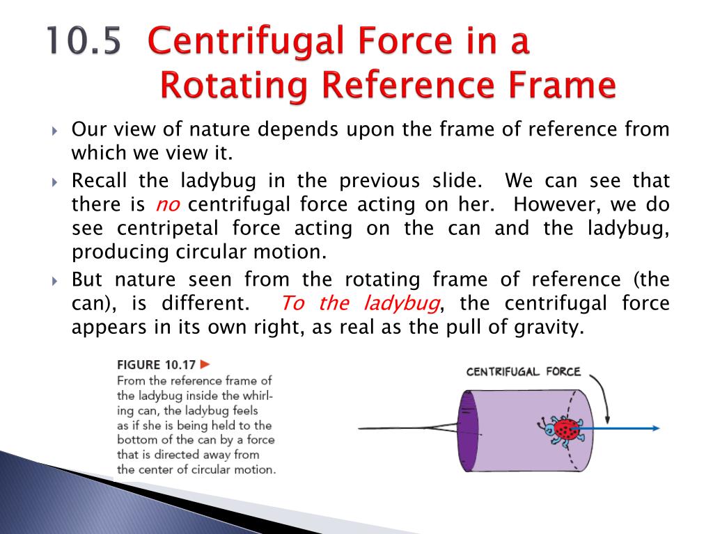10.5 Centrifugal Force in a Rotating Reference Frame • Our view of nature depends upon the frame of reference from which we view it. • Recall the ladybug in the previous slide. We can see that there is no centrifugal force acting on her. However, we do see centripetal force acting on the can and the ladybug, producing circular motion. • But nature seen from the rotating frame of reference (the can), is different. To the ladybug, the centrifugal force appears in its own right, as real as the pull of gravity.
