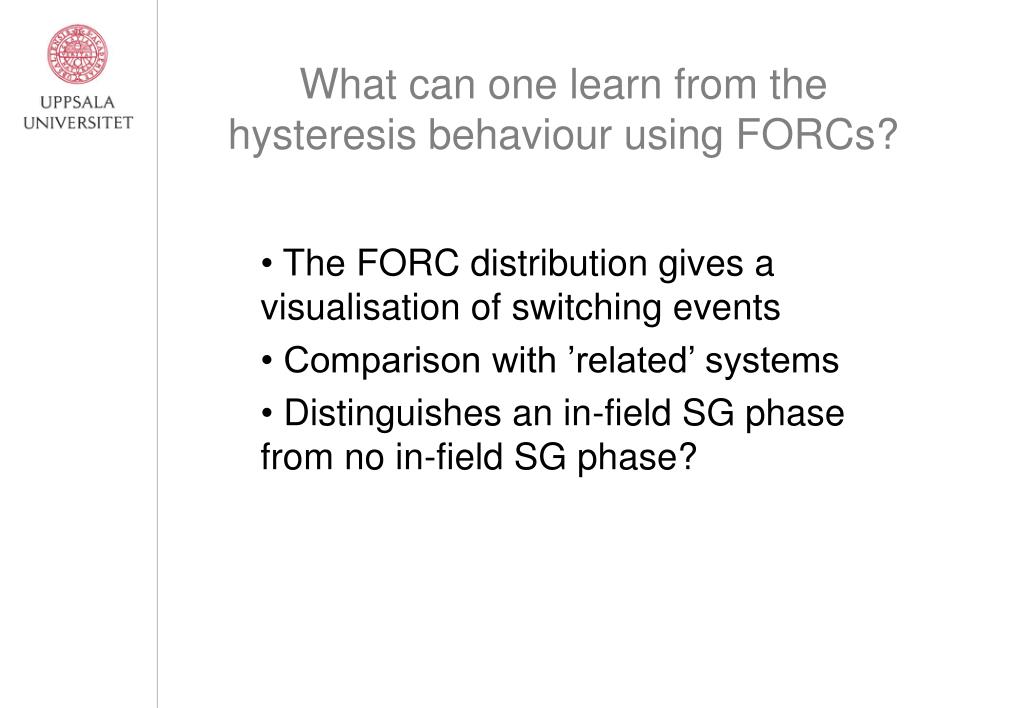 What can one learn from the hysteresis behaviour using FORCs? The FORC distribution gives a visualisation of switching events Comparison with ’related’ systems Distinguishes an in-field SG phase from no in-field SG phase?