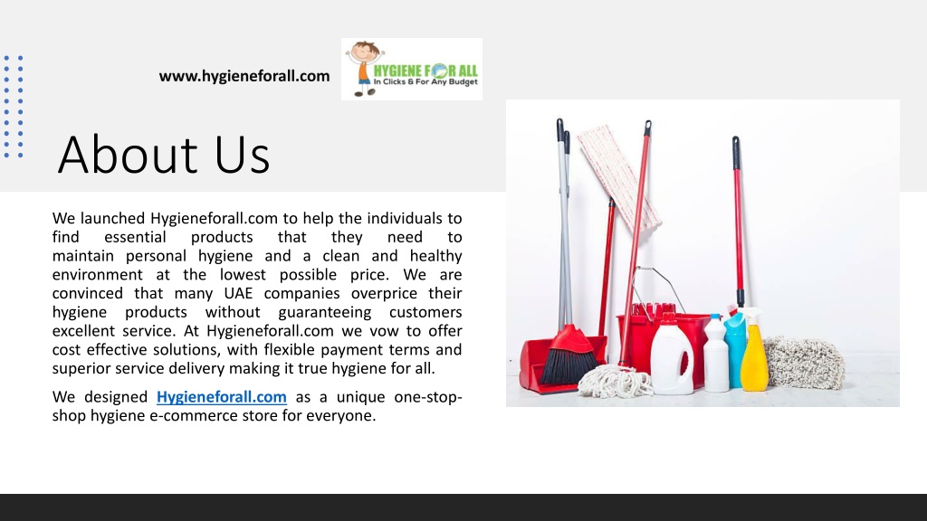 About Us www.hygieneforall.com We launched Hygieneforall.com to help the individuals to find essential products that they need to maintain personal hygiene and a clean and healthy environment at the lowest possible price. We are convinced that many UAE companies overprice their hygiene products without guaranteeing customers excellent service. At Hygieneforall.com we vow to offer cost effective solutions, with flexible payment terms and superior service delivery making it true hygiene for all. We designed Hygieneforall.com as a unique one-stop-shop hygiene e-commerce store for everyone.