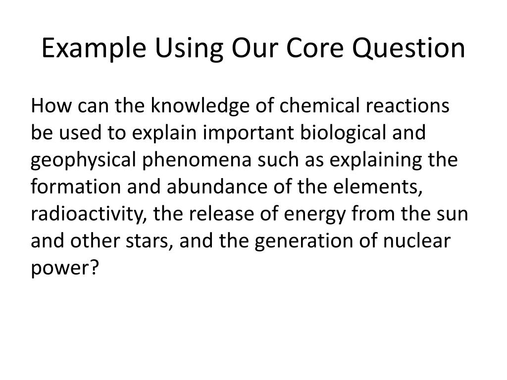 Example Using Our Core Question How can the knowledge of chemical reactions be used to explain important biological and geophysical phenomena such as explaining the formation and abundance of the elements, radioactivity, the release of energy from the sun and other stars, and the generation of nuclear power?