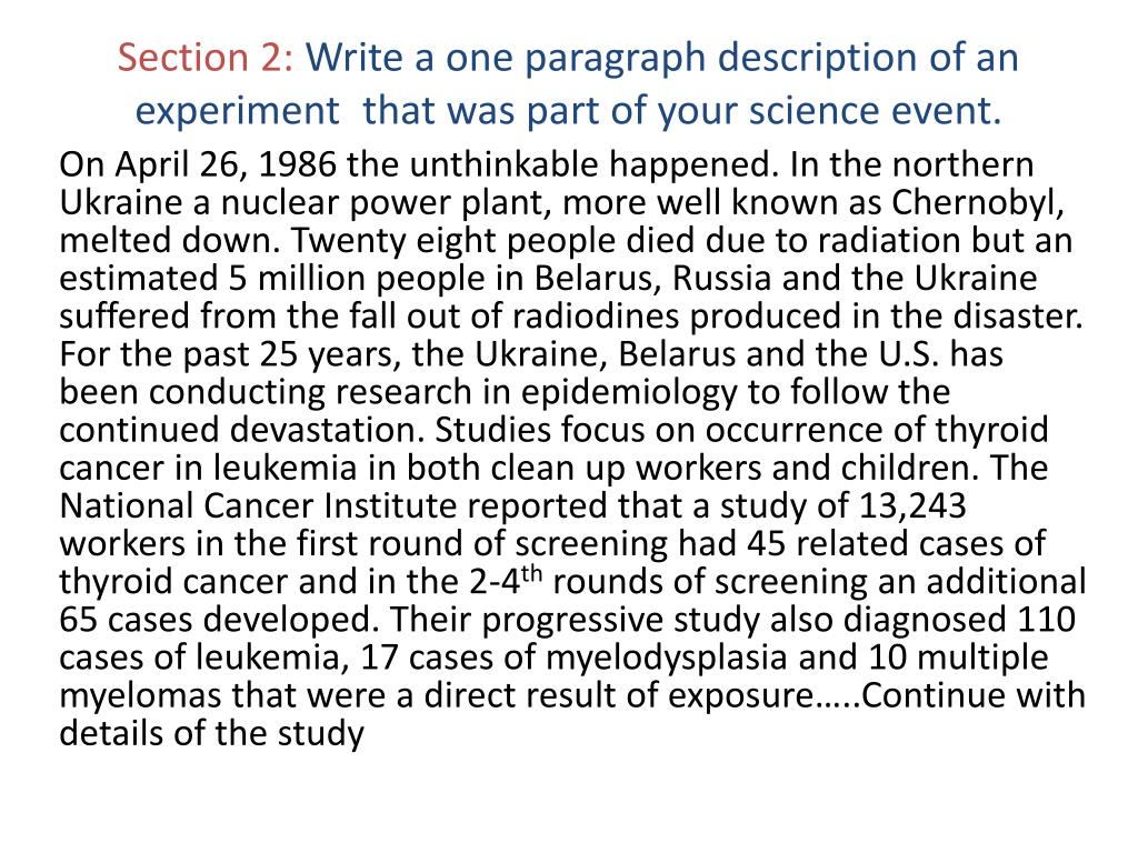 Section 2: Write a one paragraph description of an experiment that was part of your science event. On April 26, 1986 the unthinkable happened. In the northern Ukraine a nuclear power plant, more well known as Chernobyl, melted down. Twenty eight people died due to radiation but an estimated 5 million people in Belarus, Russia and the Ukraine suffered from the fall out of radiodines produced in the disaster. For the past 25 years, the Ukraine, Belarus and the U.S. has been conducting research in epidemiology to follow the continued devastation.Studies focus on occurrence of thyroid cancer in leukemia in both clean up workers and children. The National Cancer Institute reported that a study of 13,243 workers in the first round of screening had 45 related cases of thyroid cancer and in the 2-4th rounds of screening an additional 65 cases developed. Their progressive study also diagnosed 110 cases of leukemia, 17 cases of myelodysplasia and 10 multiple myelomas that were a direct result of exposure…..Continue with details of the study