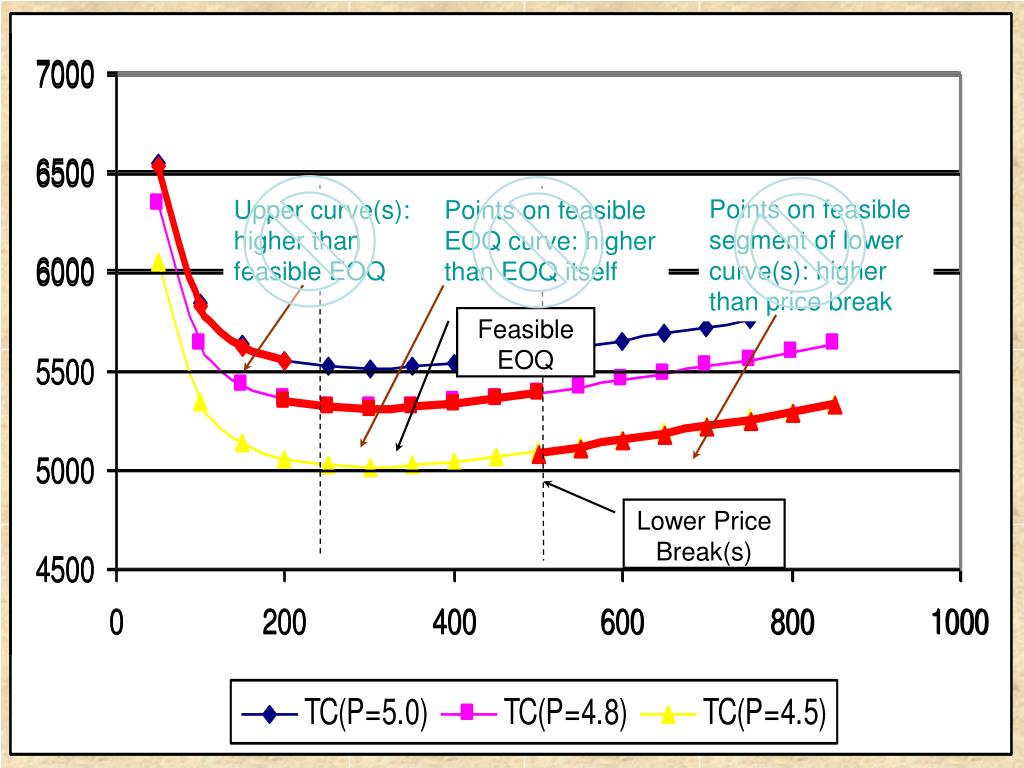 Points on feasible segment of lower curve(s): higher than price break Upper curve(s): higher than feasible EOQ Points on feasible EOQ curve: higher than EOQ itself Feasible EOQ Lower Price Break(s)