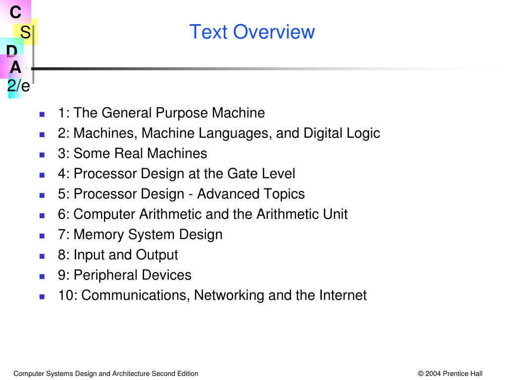 Text Overview • 1: The General Purpose Machine • 2: Machines, Machine Languages, and Digital Logic • 3: Some Real Machines • 4: Processor Design at the Gate Level • 5: Processor Design - Advanced Topics • 6: Computer Arithmetic and the Arithmetic Unit • 7: Memory System Design • 8: Input and Output • 9: Peripheral Devices • 10: Communications, Networking and the Internet