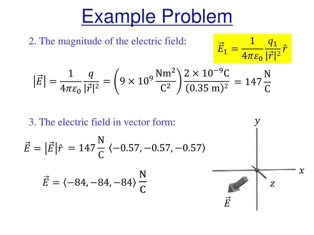 Example Problem 2. The magnitude of the electric field: 3. The electric field in vector form: