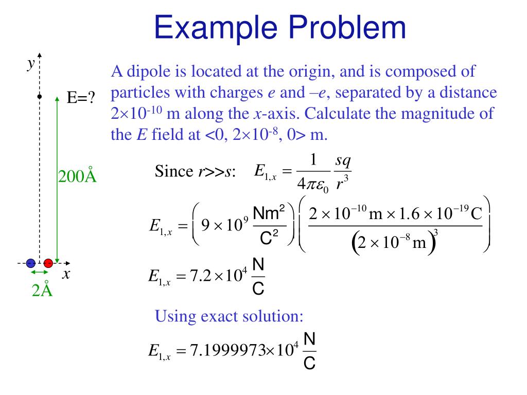Example Problem y A dipole is located at the origin, and is composed of particles with charges e and –e, separated by a distance 210-10 m along the x-axis. Calculate the magnitude of the E field at <0, 210-8, 0> m. E=? Since r>>s: 200Å x 2Å Using exact solution: