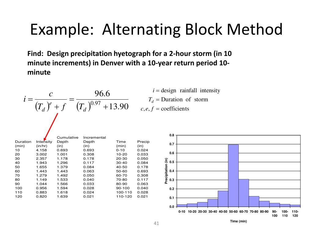 Alternating block method • Given Td and T/frequency, develop a hyetograph in Dt increments • Using T, find i for Dt, 2Dt, 3Dt,…nDt using the IDF curve for the specified location • Using i compute P for Dt, 2Dt, 3Dt,…nDt. This gives cumulative P. • Compute incremental precipitation from cumulative P. • Pick the highest incremental precipitation (maximum block) and place it in the middle of the hyetograph. Pick the second highest block and place it to the right of the maximum block, pick the third highest block and place it to the left of the maximum block, pick the fourth highest block and place it to the right of the maximum block (after second block), and so on until the last block.