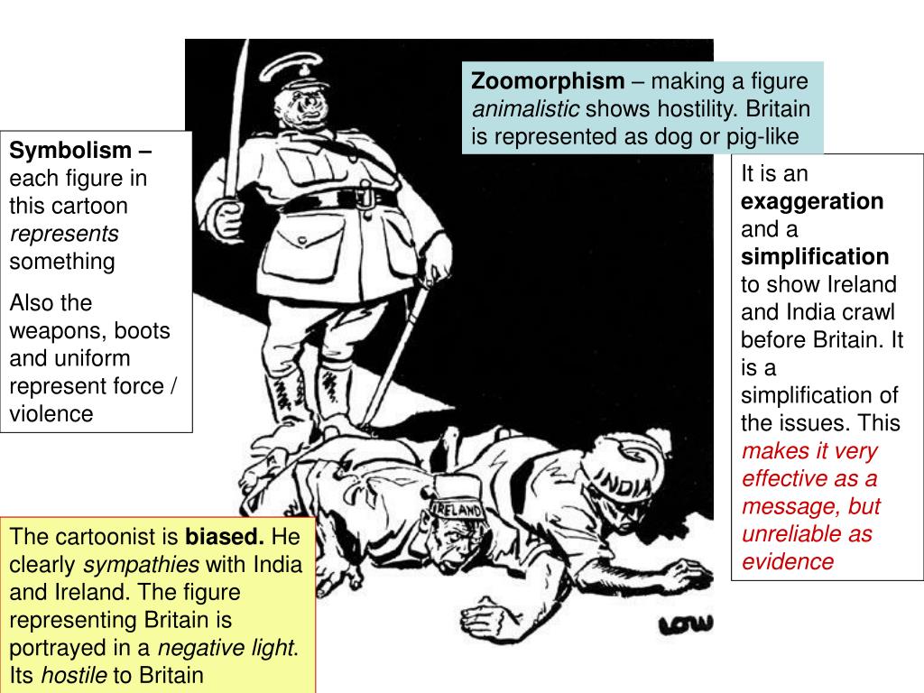 Zoomorphism – making a figure animalistic shows hostility. Britain is represented as dog or pig-like Symbolism – each figure in this cartoon represents something Also the weapons, boots and uniform represent force / violence It is an exaggeration and a simplification to show Ireland and India crawl before Britain. It is a simplification of the issues. This makes it very effective as a message, but unreliable as evidence The cartoonist is biased. He clearly sympathies with India and Ireland. The figure representing Britain is portrayed in a negative light. Its hostile to Britain