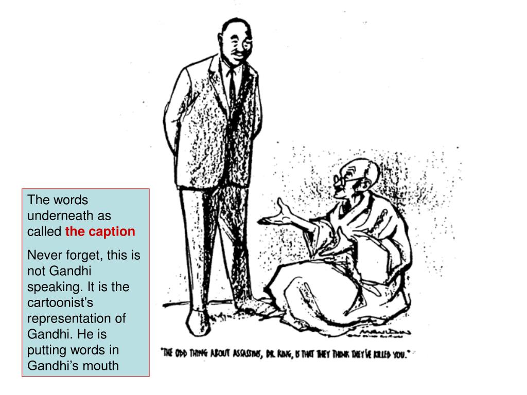 The words underneath as called the caption Never forget, this is not Gandhi speaking. It is the cartoonist’s representation of Gandhi. He is putting words in Gandhi’s mouth