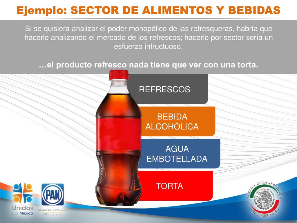 Ejemplo: SECTOR DE ALIMENTOS Y BEBIDAS Si se quisiera analizar el poder monopólico de las refresqueras, habría que hacerlo analizando el mercado de los refrescos; hacerlo por sector sería un esfuerzo infructuoso. …el producto refresco nada tiene que ver con una torta. REFRESCOS BEBIDA ALCOHÓLICA AGUA EMBOTELLADA TORTA