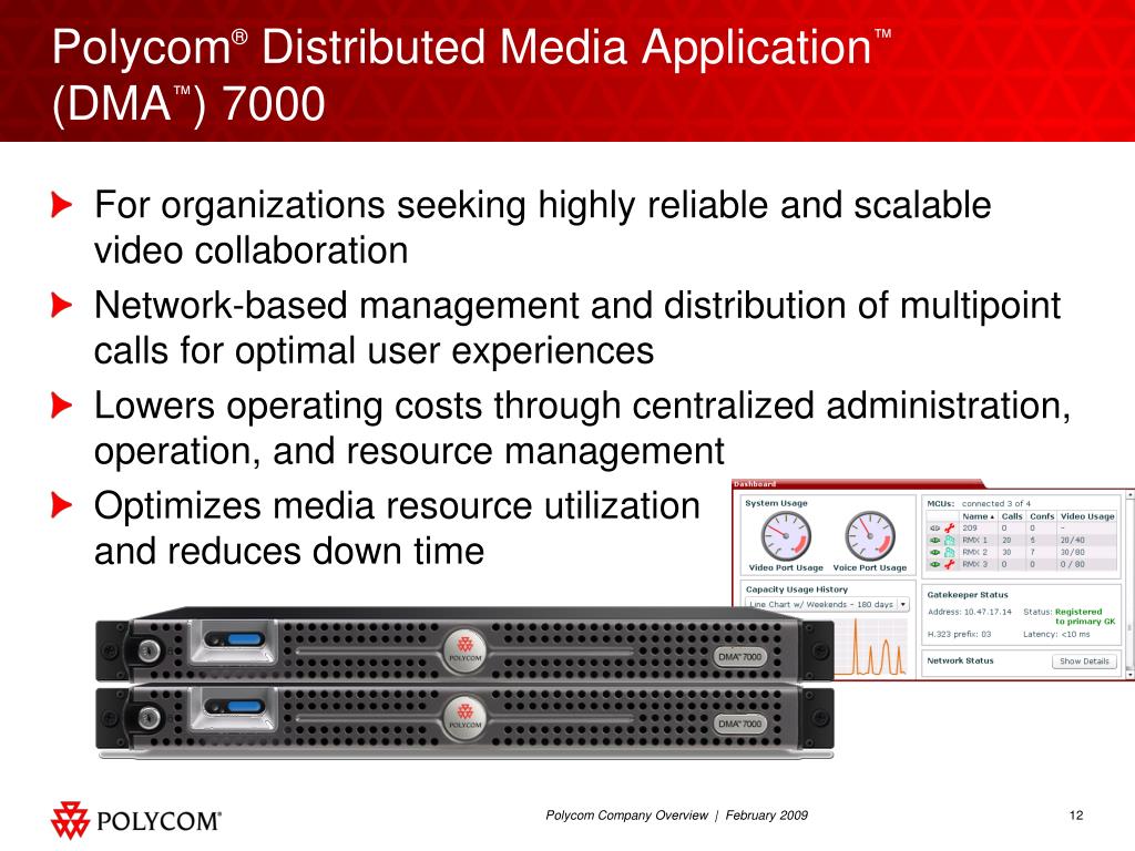 Polycom® Distributed Media Application™(DMA™) 7000 • For organizations seeking highly reliable and scalable video collaboration • Network-based management and distribution of multipoint calls for optimal user experiences • Lowers operating costs through centralized administration, operation, and resource management • Optimizes media resource utilization and reduces down time