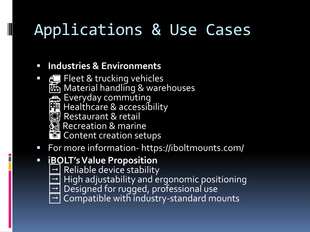 Applications & Use Cases • Industries & Environments • 🚚 Fleet & trucking vehicles🏭 Material handling & warehouses🚗 Everyday commuting🏥 Healthcare & accessibility🍽 Restaurant & retail🎣 Recreation & marine📸 Content creation setups • For more information- https://iboltmounts.com/ • iBOLT’s Value Proposition➡ Reliable device stability➡ High adjustability and ergonomic positioning➡ Designed for rugged, professional use➡ Compatible with industry-standard mounts